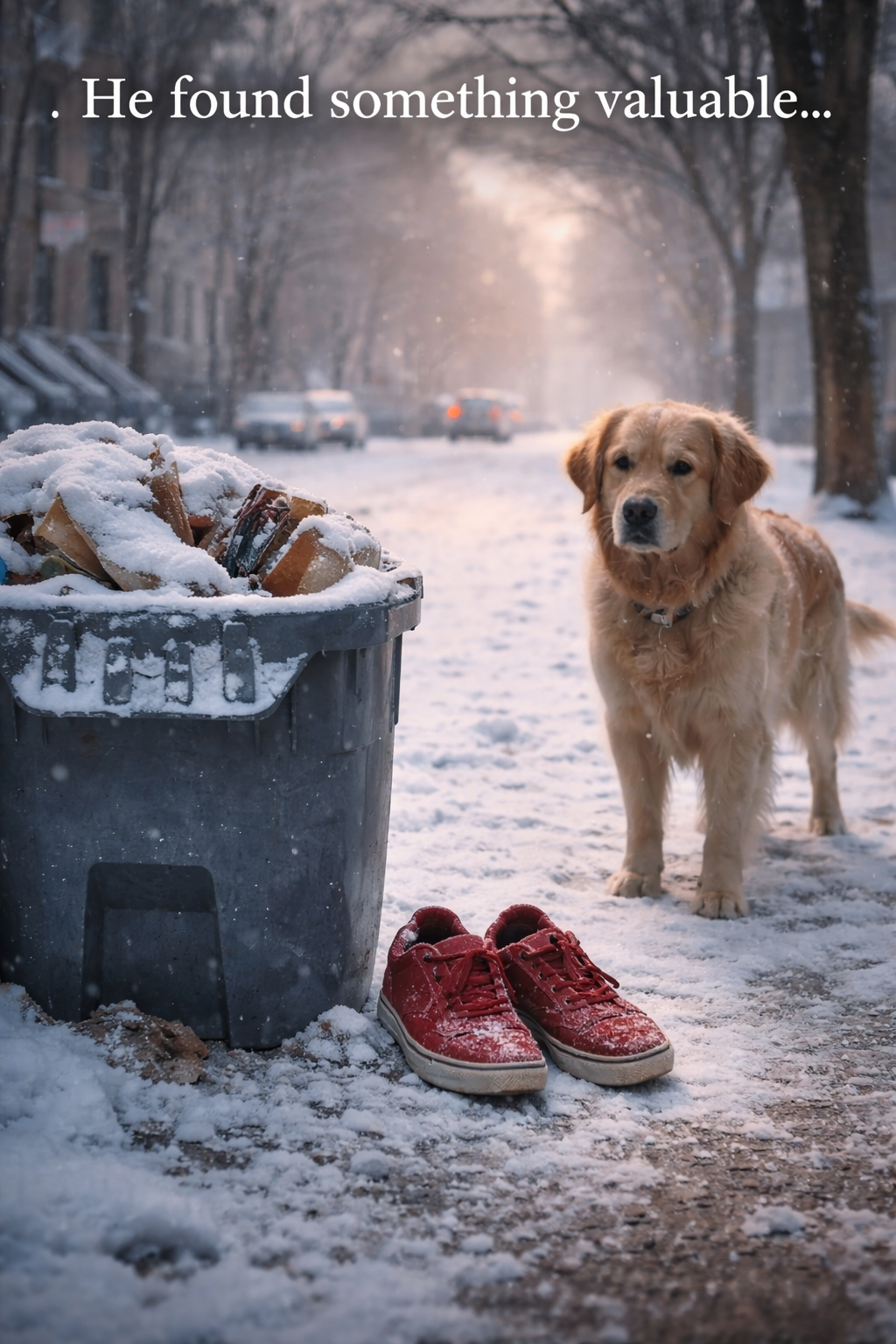 Snow fell lightly, covering sidewalks and rooftops in quiet white. Near a trash bin on a nearly empty street, a pair of bright red shoes stood out against the snow. Clean. Almost new. Abandoned.